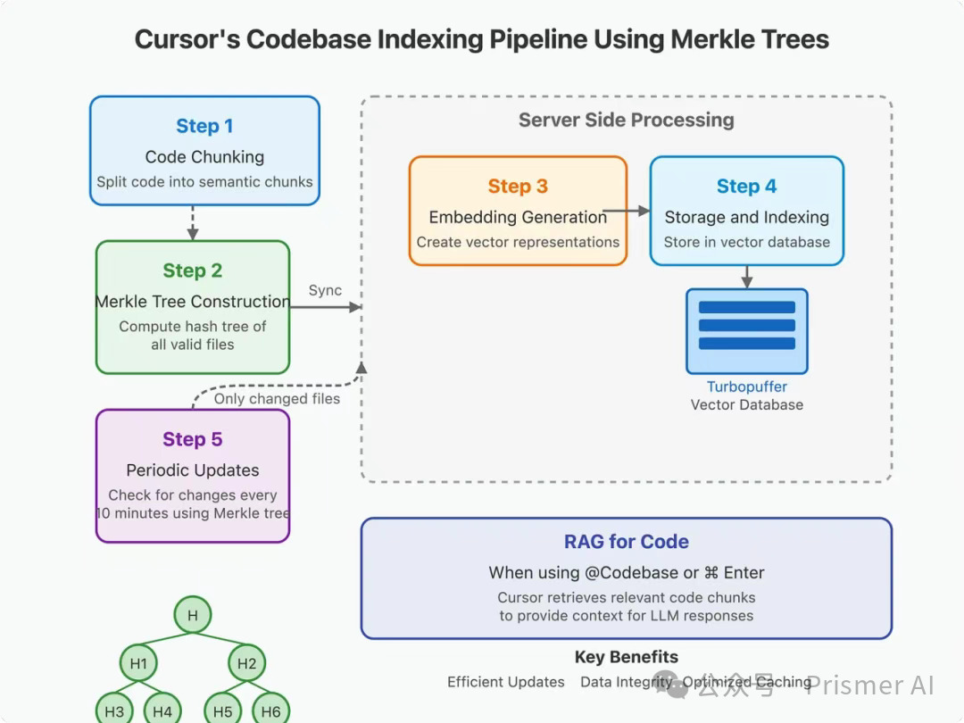 但 Cursor 团队的思路的差异化救了他们一命,2023 年 Cursor 基于 VS Code 分支开发时,已具备基础的单文件代码分析能力,依赖 OpenAI 的 GPT-4 和 Claude 模型实现简单的代码补全和错误检测。靠着代码库分析能力,基于 Merkle 树驱动的增量更新,语法树分段,和云端向量化计算这些在当时比较领先的技术,在使用体验完全不占优势的情况下,保住了一些火种。