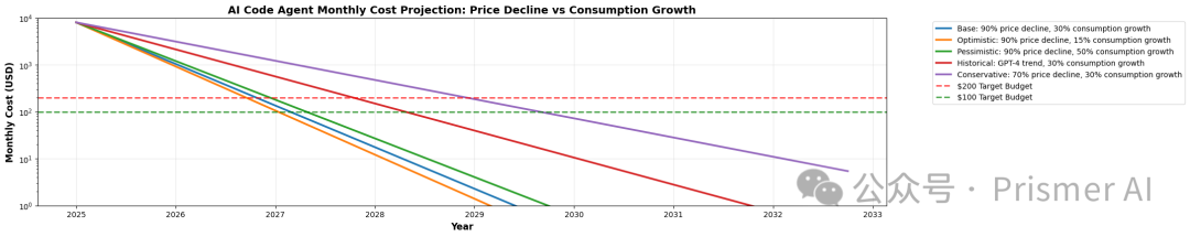 而如果我们以最合理的迭代方式,考虑只使用当下最新的 SOTA 基座模型+ 不断进步的 context engineering + 每个时间点的 SOTA 基座模型推理成本相比前一年下降 90%。 可以看到这个收敛和平衡区间基本在 2028 年之后了。除了几个变量要考虑: