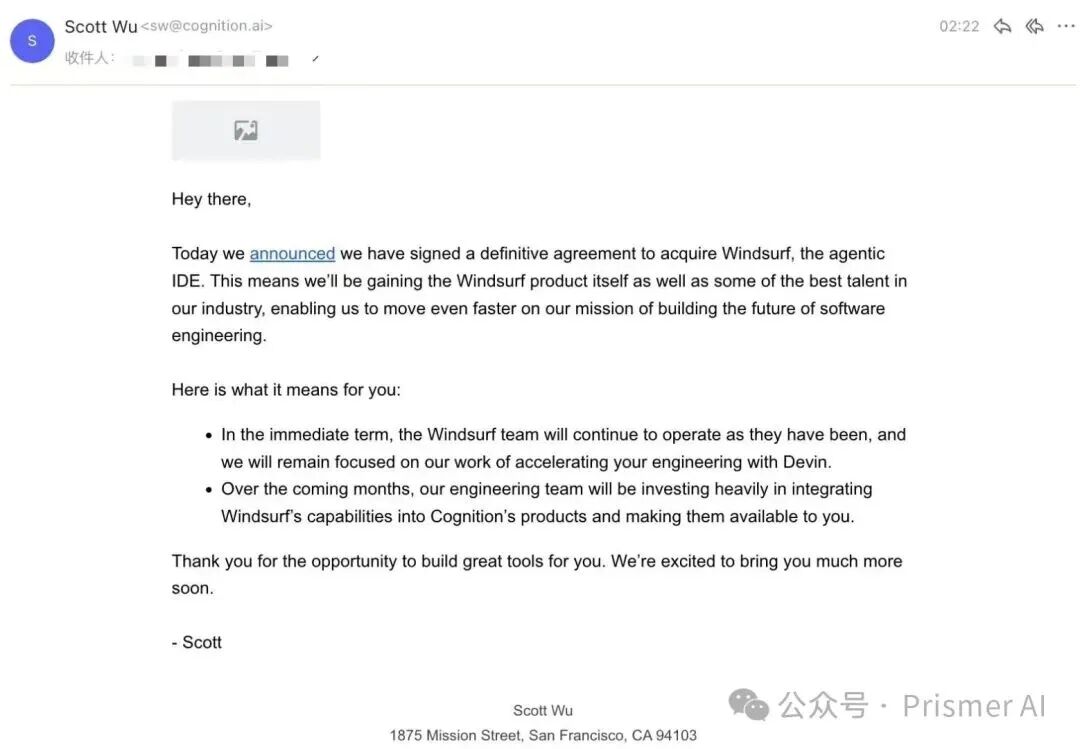 有了余粮,Scott 瞬间支棱买下了 Winsurf 的剩余资产,笔者甚至收到了 Scott 的邮件。