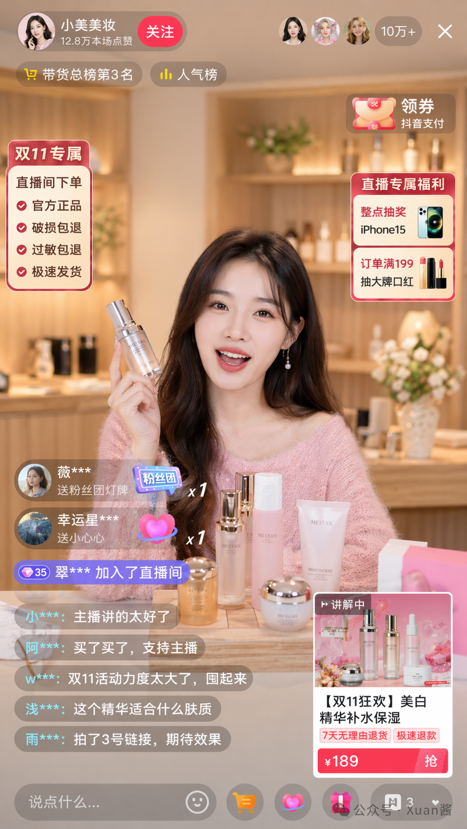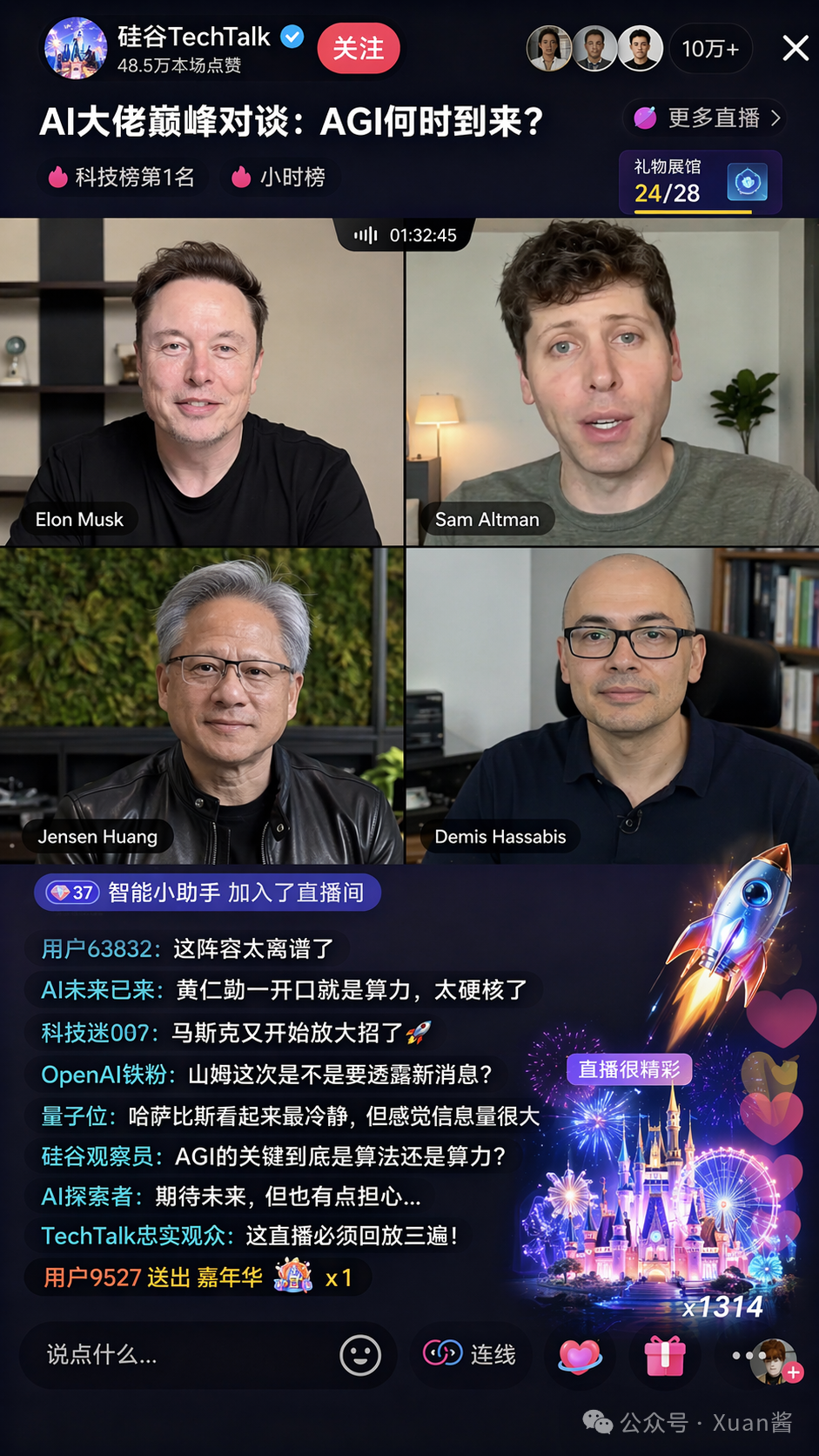还有这个硅谷大佬连麦直播的画面。如果我不说是Image2做的,你大概率会以为是截图出来的。这个账号信息、在线人数、弹幕的文字,和直播间截图没有任何区别,满屏的文字精准无误。