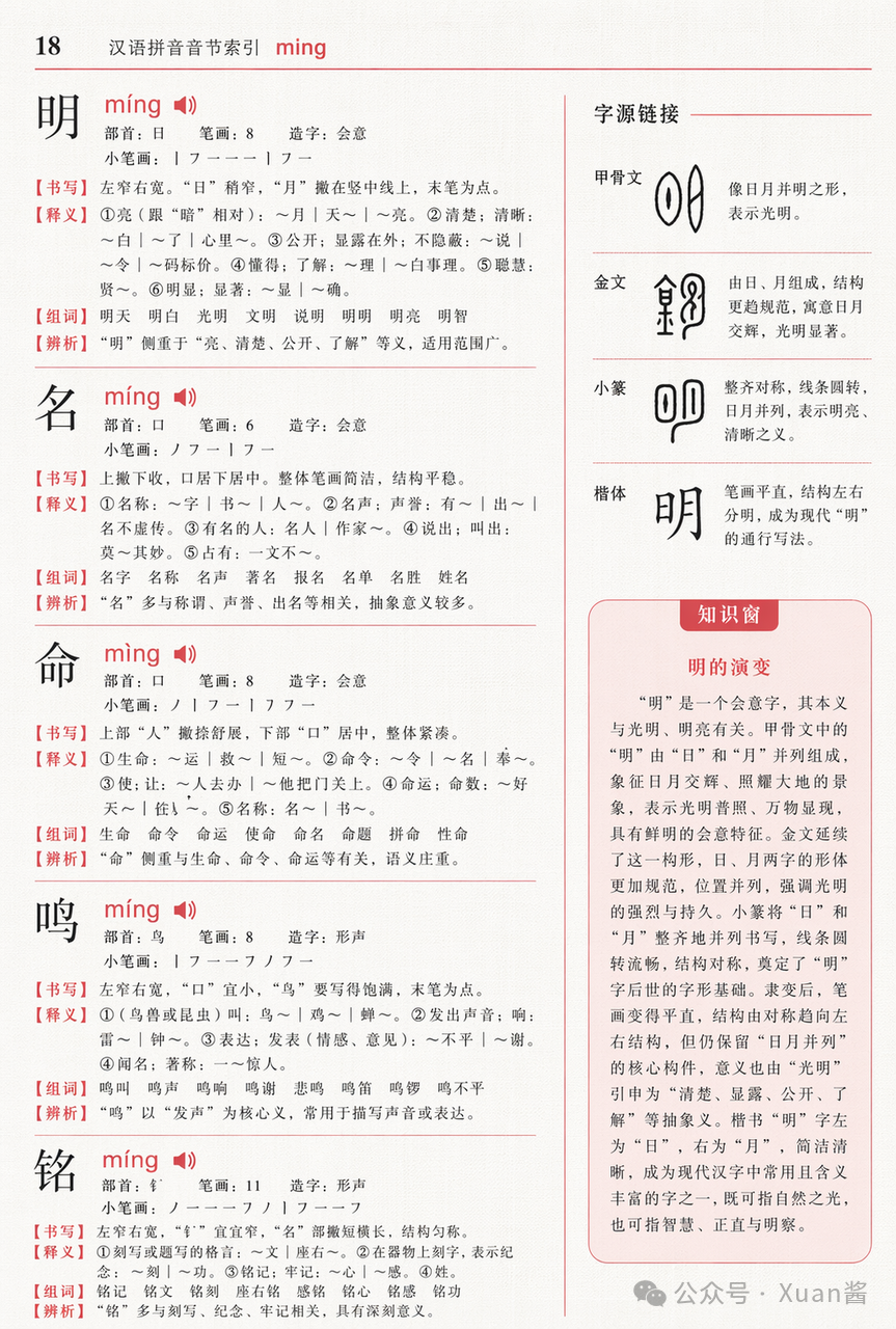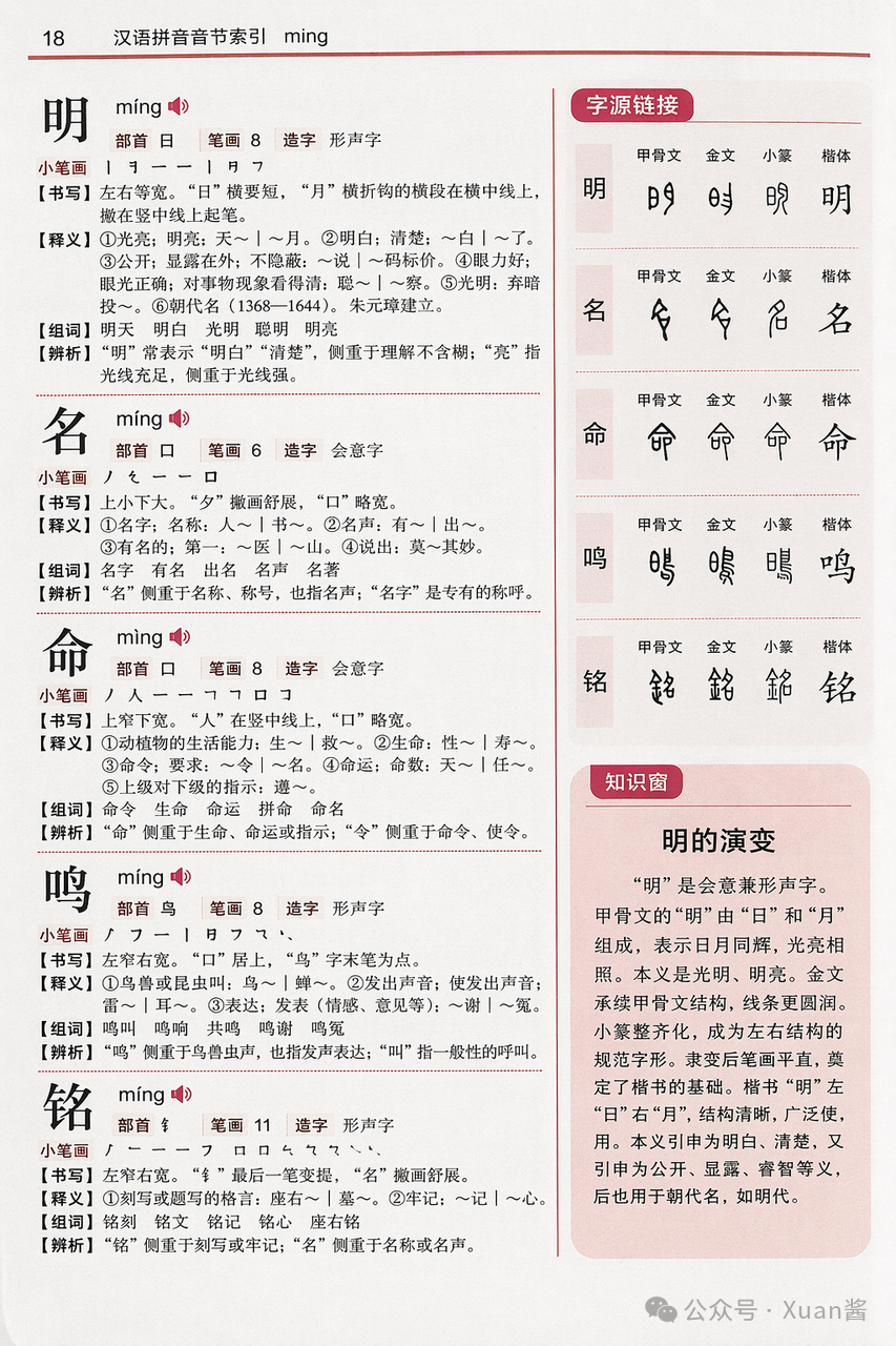 还有它生成的这张“ming”的字典页,高度还原了真实的版式。主词条使用了醒目的大字号宋体,栏目标题则是黑体。右边的字源链接,居然生成了“明字”从甲骨文、到金文、小篆和楷体的演变过程,每种字体的神韵都把握得很准。