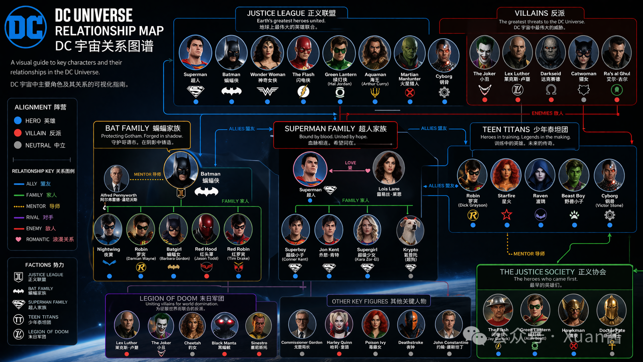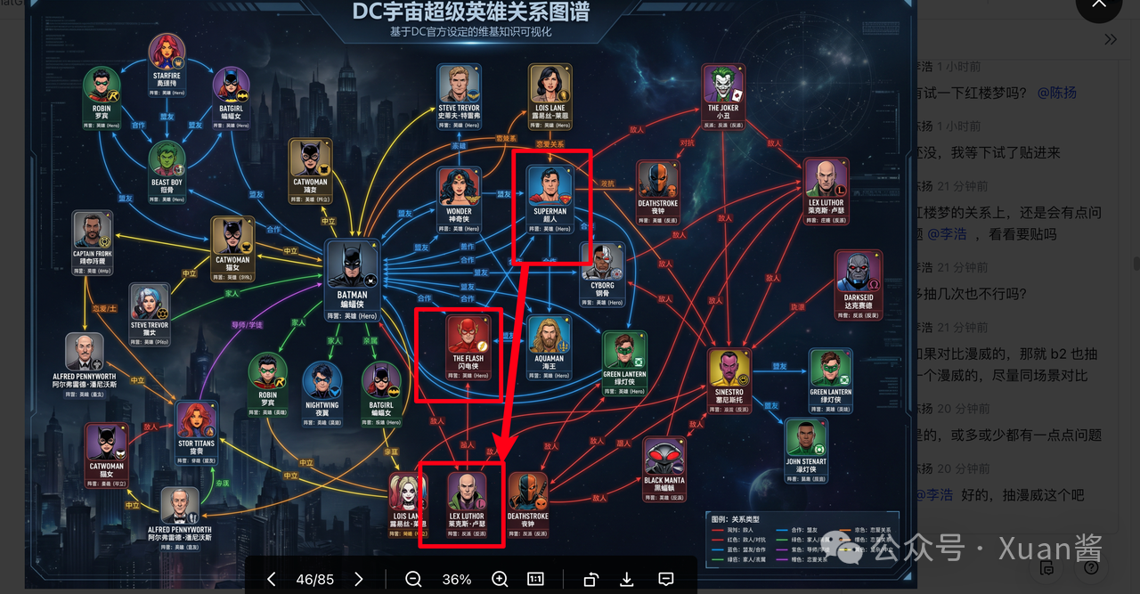 我也用Banana2跑了这个关系图谱,但是Banana2逻辑上还是会出错。比如和卢瑟有敌对关系的是超人而不是闪电侠,整体排版什么的也不如Image2看着舒服。