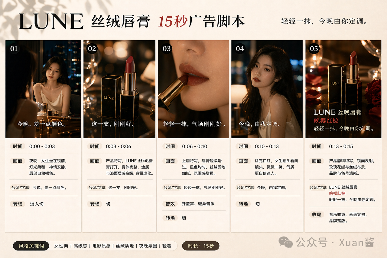 比如要做个口红广告片,先让Image2直接做一张包含时间轨、画面、台词、转场的分镜图片,再把这个图给Seedance2.0这样的视频模型,一句话,就能做出这样的视频,生产力提升了不止一个档次。
