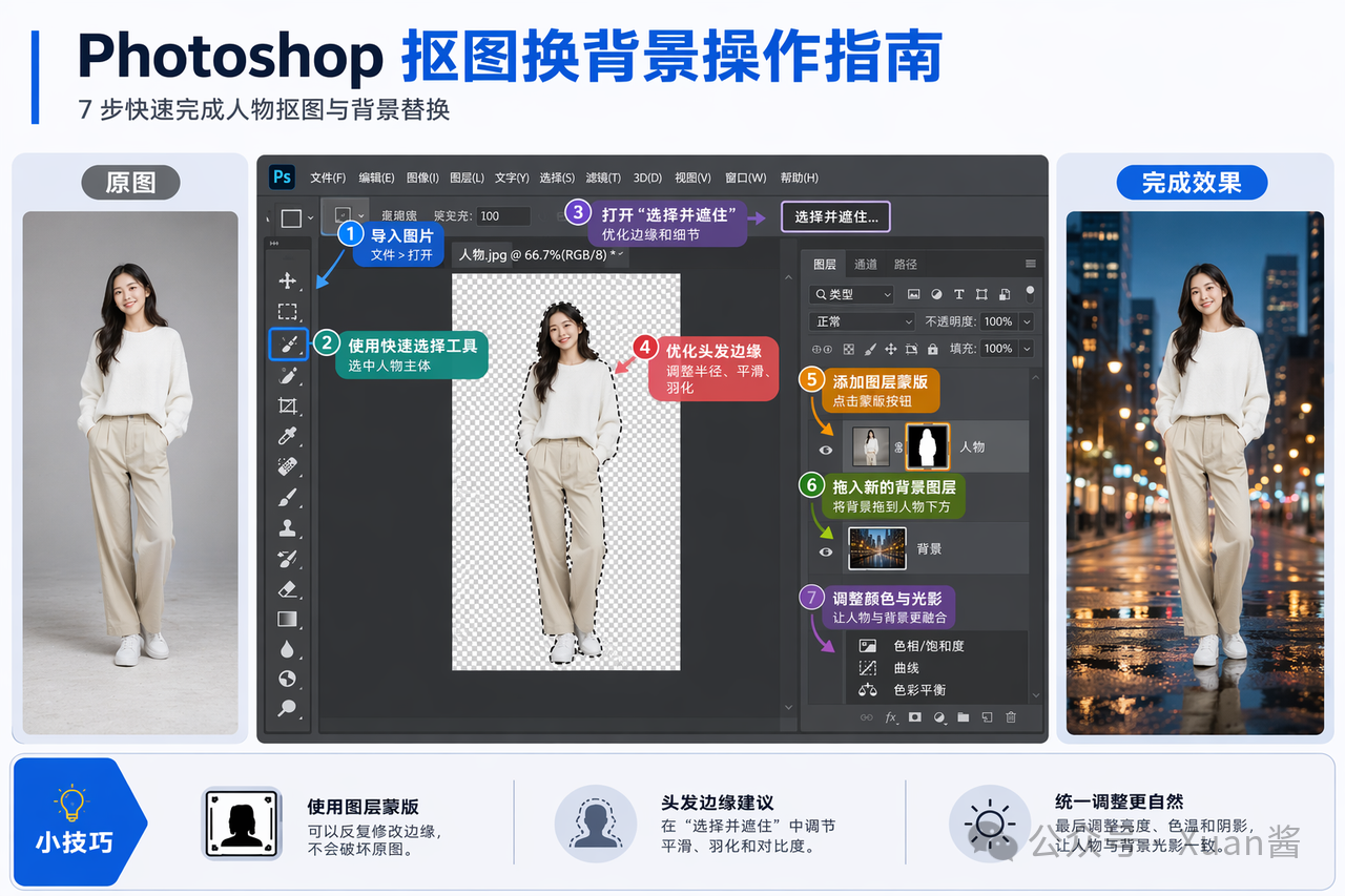 还有这个,比如你想学如何用PS抠图,懒得找教程,直接让Image2做个PS抠图的图文教程给你。一步步怎么操作,逻辑清晰,完成度非常高。