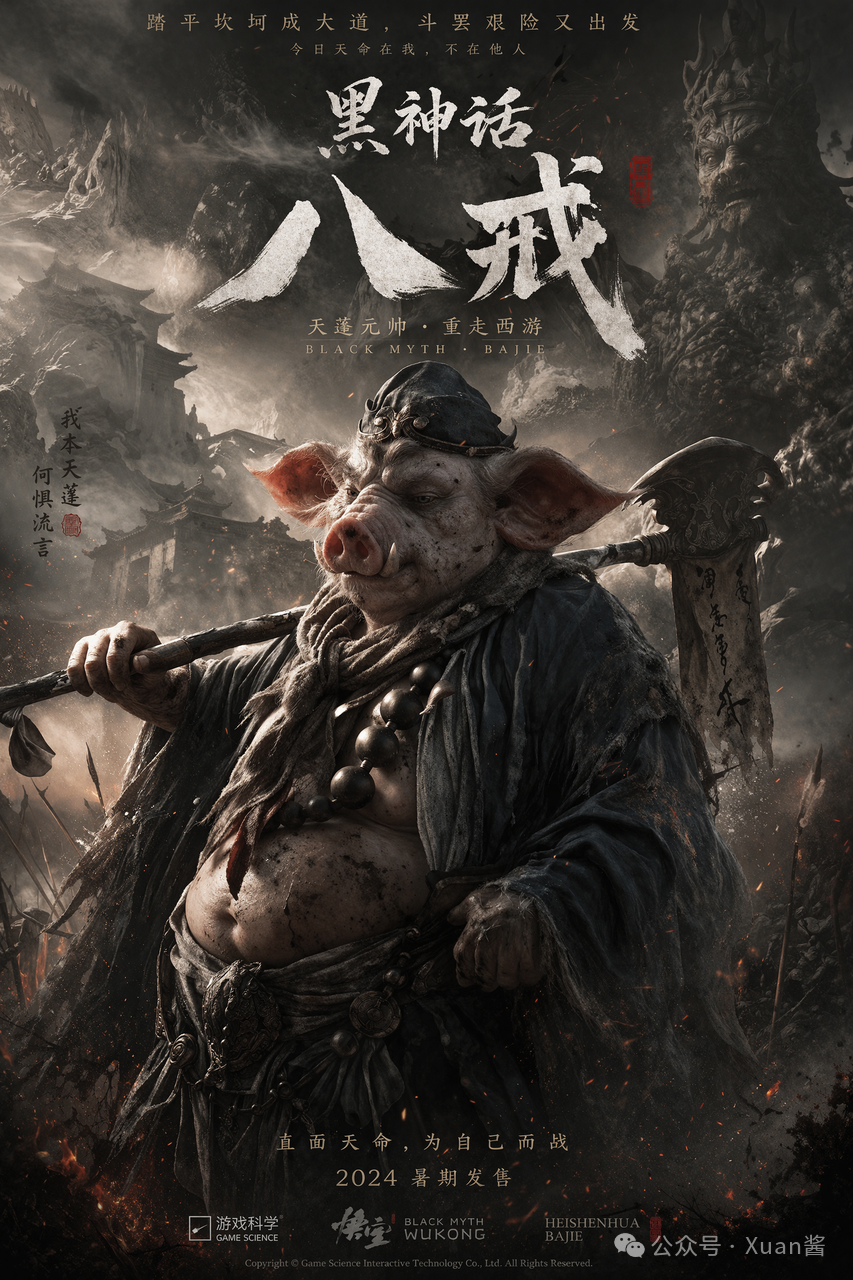 比如让它模仿黑神话悟空的风格,做个黑神话八戒的海报。