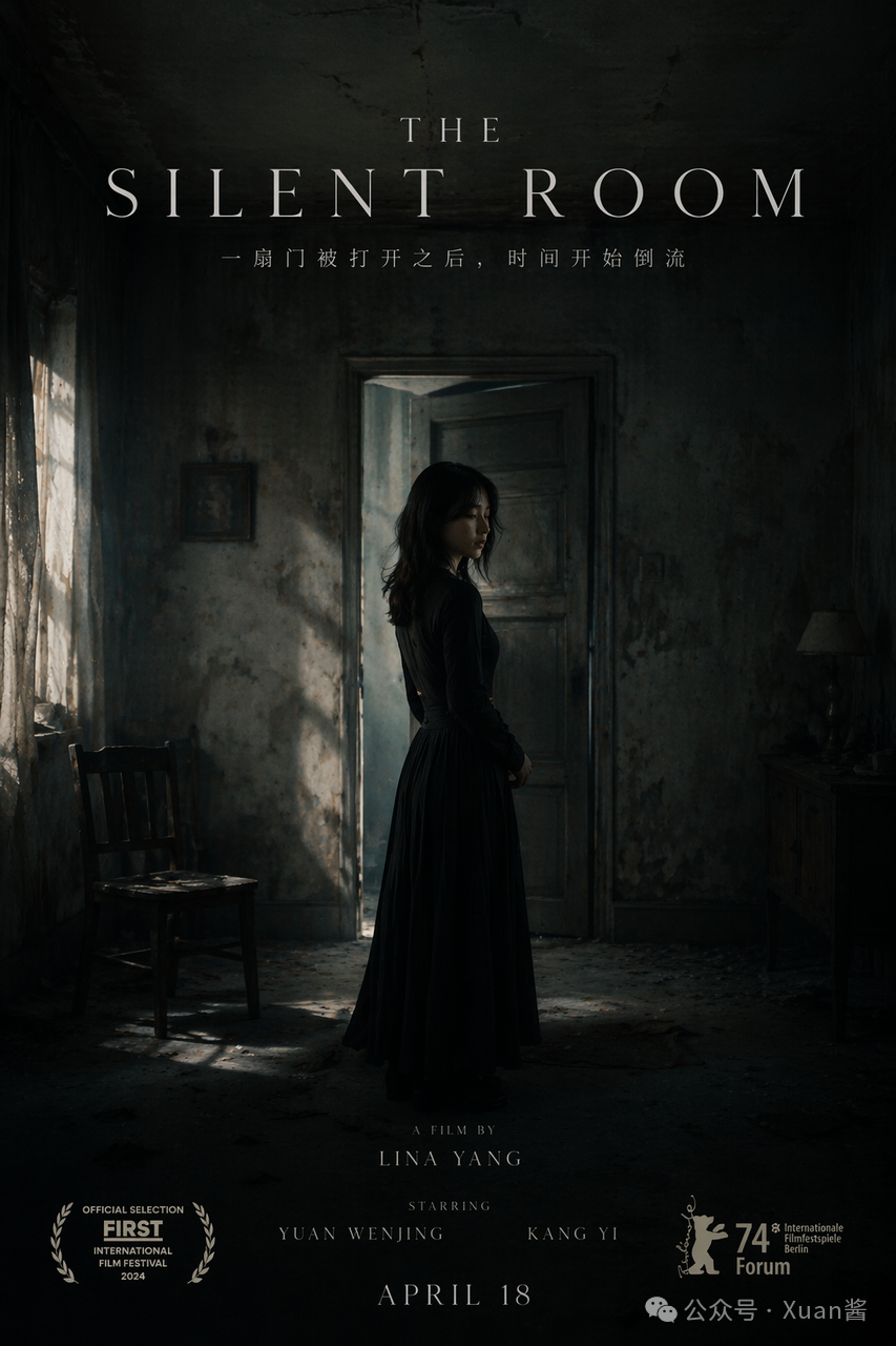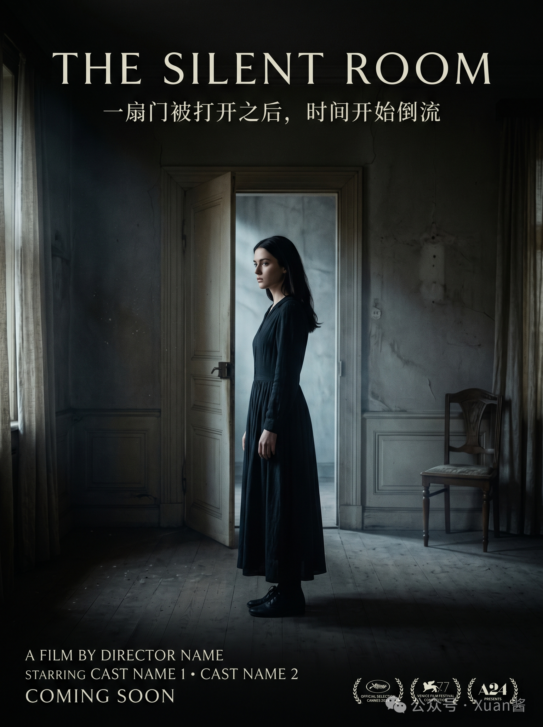 整体上看,Image2生成的海报整个画面对氛围光影拿捏得十分到位。身穿深色长裙的女主完全融入了整个环境。细节上,门外的冷光、老木椅、旧窗帘、灰尘,这些搭配得也很完美,海报把幽暗、悬疑的感觉拉满了。