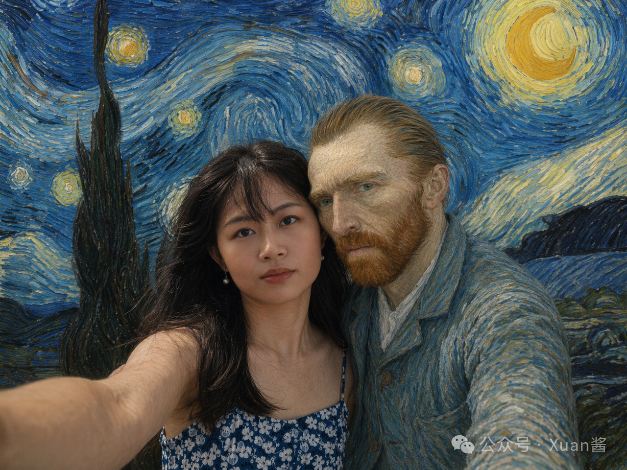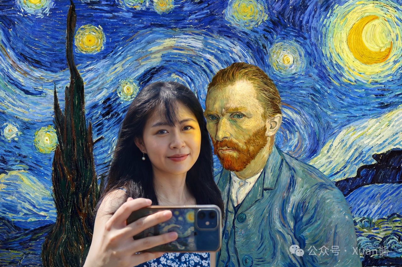 比如我和梵高的合影。大家可以猜一下,哪个是Image2,哪个是Banana2做的。