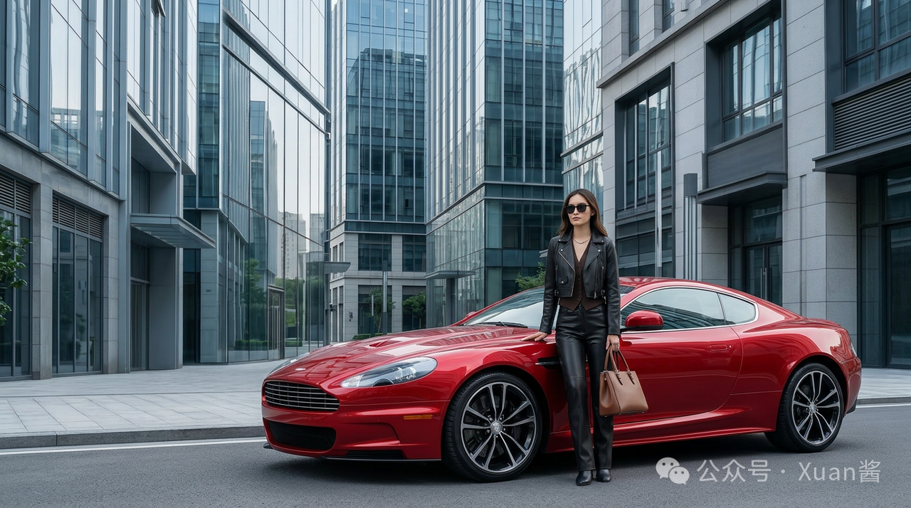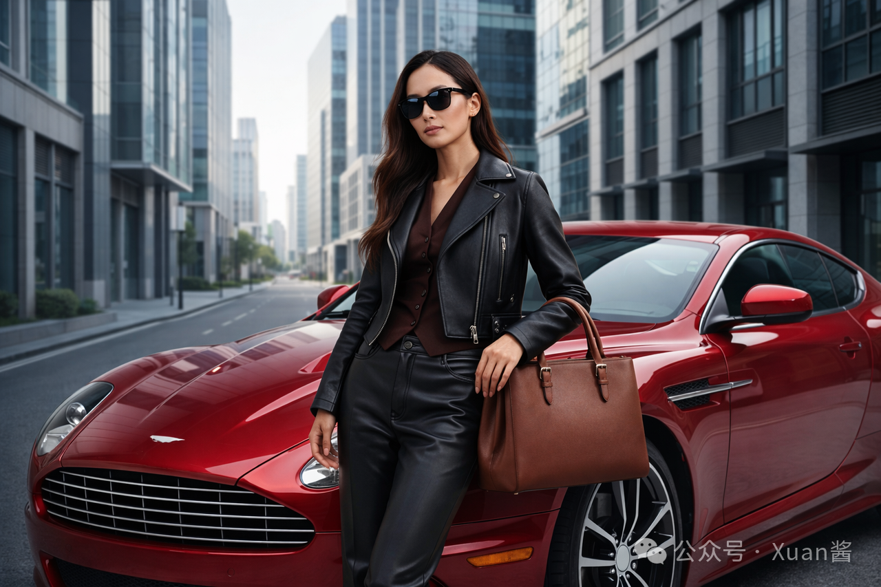 再来看看多个主体的一致性,这是AI非常容易翻车的场景。比如让这个女生穿上皮衣,戴上墨镜,拎这个包,靠在车旁,场景参考这个街道。